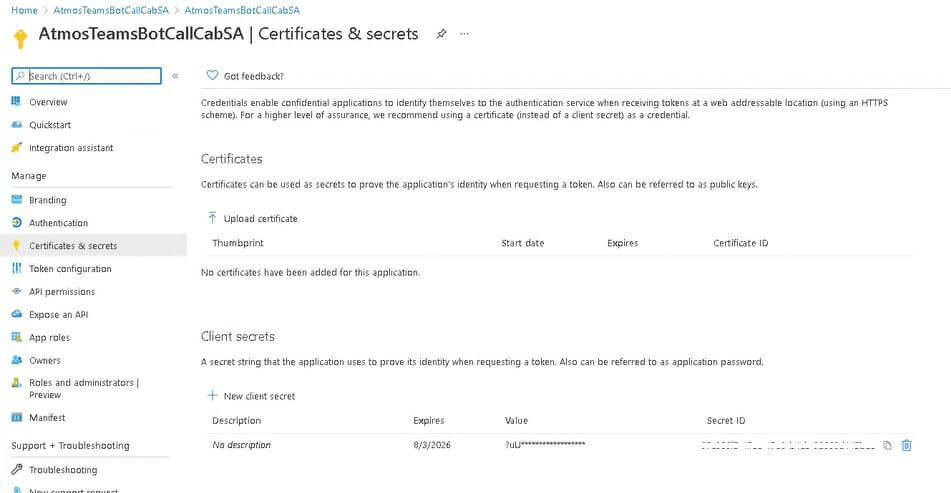 - 8.4. Copy the secret key value that is created into a document for later use. This secret value will be needed by the CallCabinet Teams Recorder VM / cloud service.