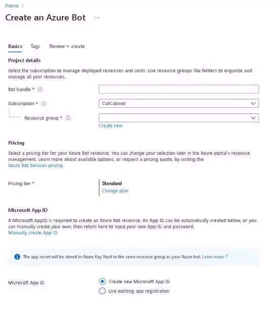 - 2.1.1. Under the “Basics” tab, add a unique Bot name (Bot handle) – “CallCabinetTeamsBot<customername>”