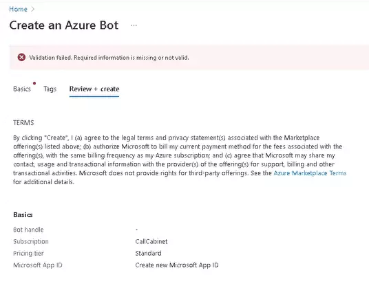 2.1. Complete “Azure Bot” required fields: