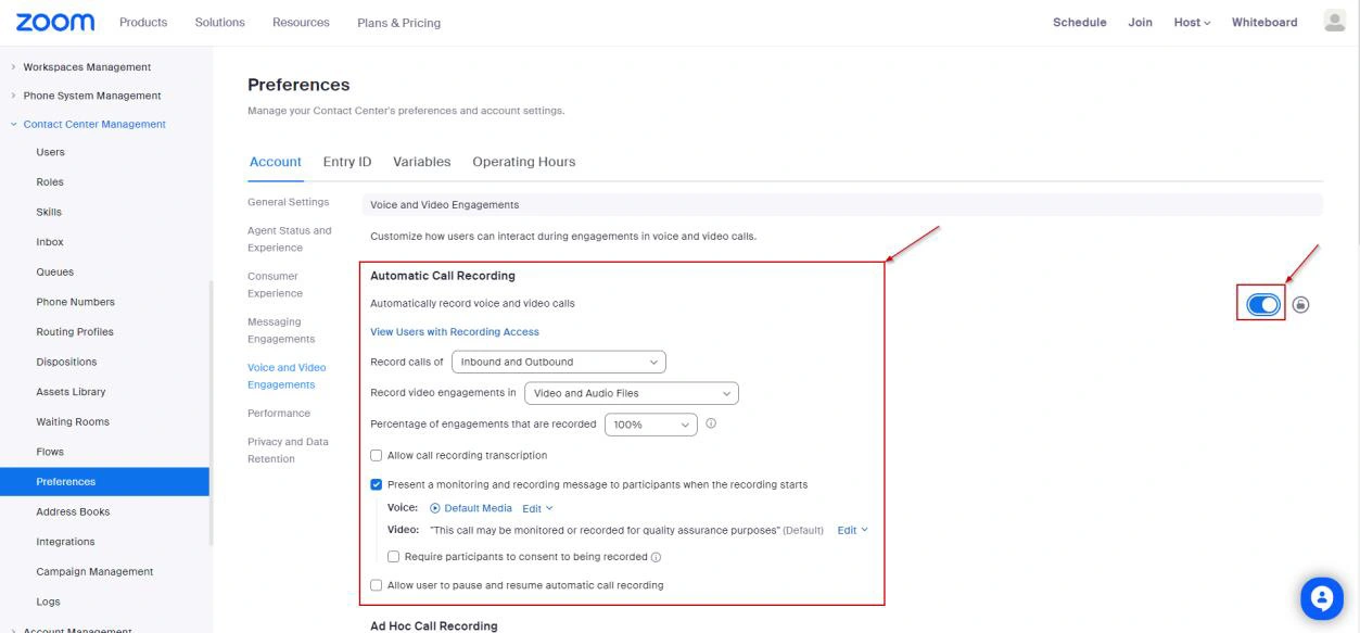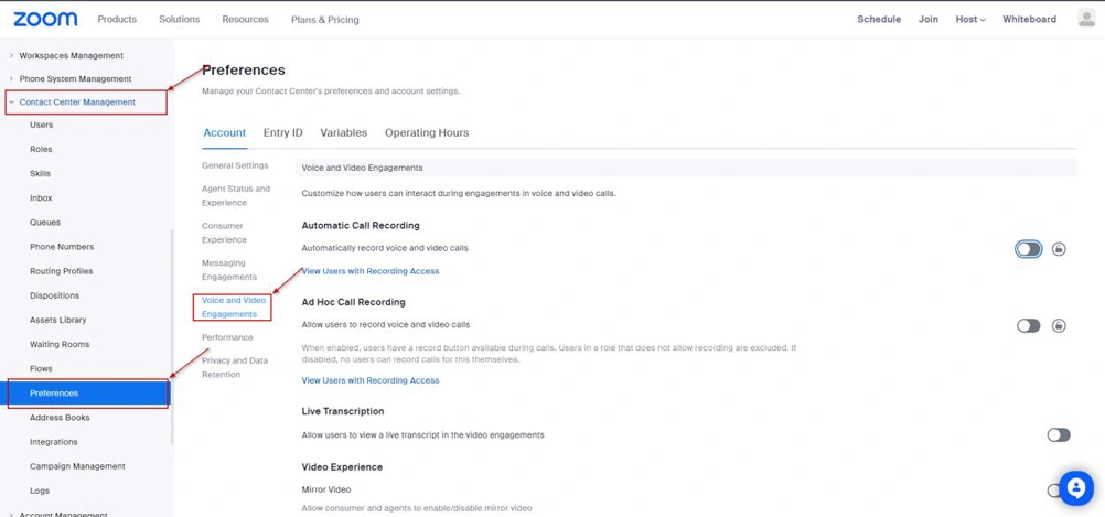 Go to your Zoom Account and click on “Contact Center Management” followed by “Preferences” and then “Voice and Video Engagements.”