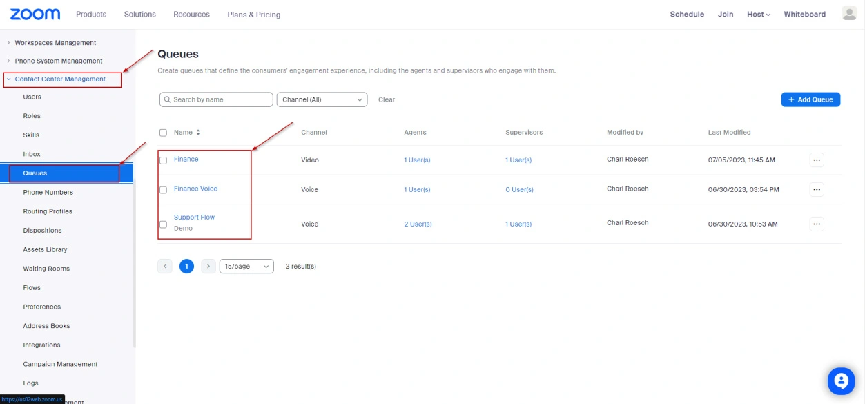 Access the “Contact Center Management” section and proceed to “Queues.” From there, select the specific Queue for which you want to modify the automatic recording settings.