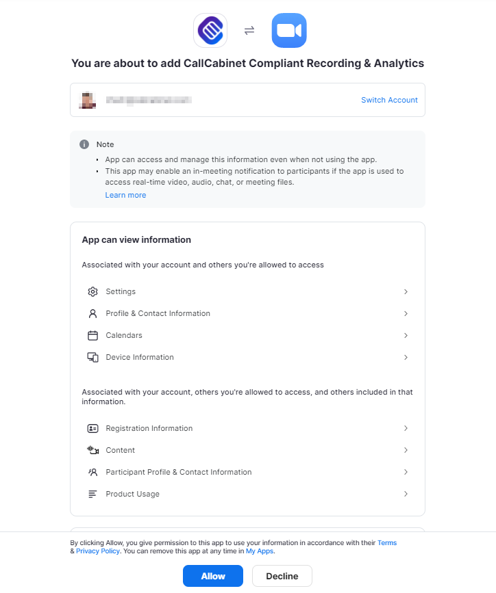 Login to your Zoom profile if requested. And review and allow permissions to install the CallCabinet Compliant Recording & Analytics app on your Zoom account.