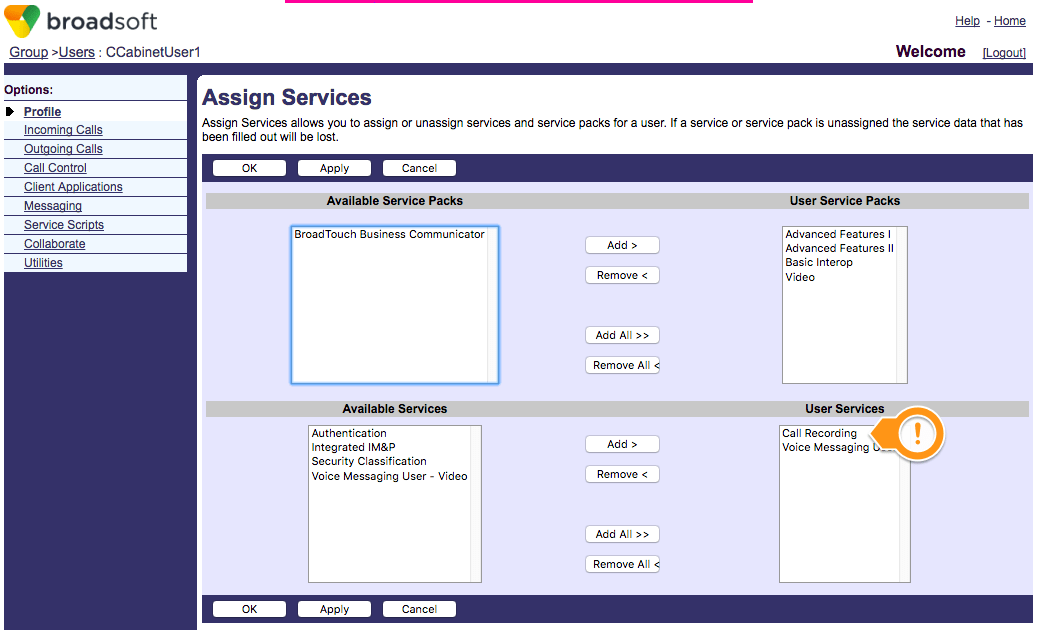 - Create a user in the Call Recording group and ensure that the Call Recording service is assigned to the user.